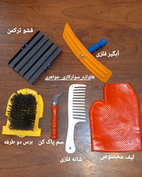 ست تیمار شامل ۶ وسيله اصلی تیمار و تمیز کردن اسب می باشد. تمام لوازم دارای بالاترین سطح کیفیت است و جنس معمولی نیست.